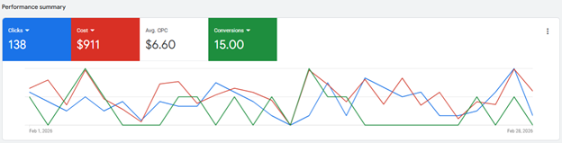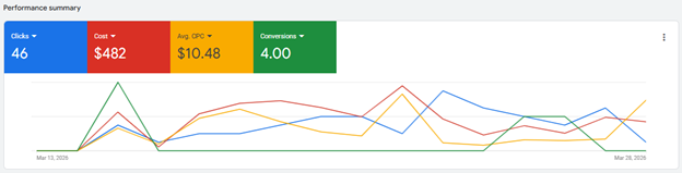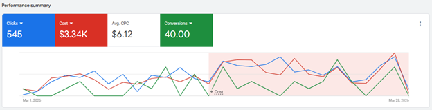 As seasonal demand began to shift in mid-March, we strategically increased ad spend to capture rising search intent. The result — 545 clicks, $3.3K in spend, and 40 conversions – significantly higher lead volume while maintaining strong cost efficiency in a competitive transportation market.